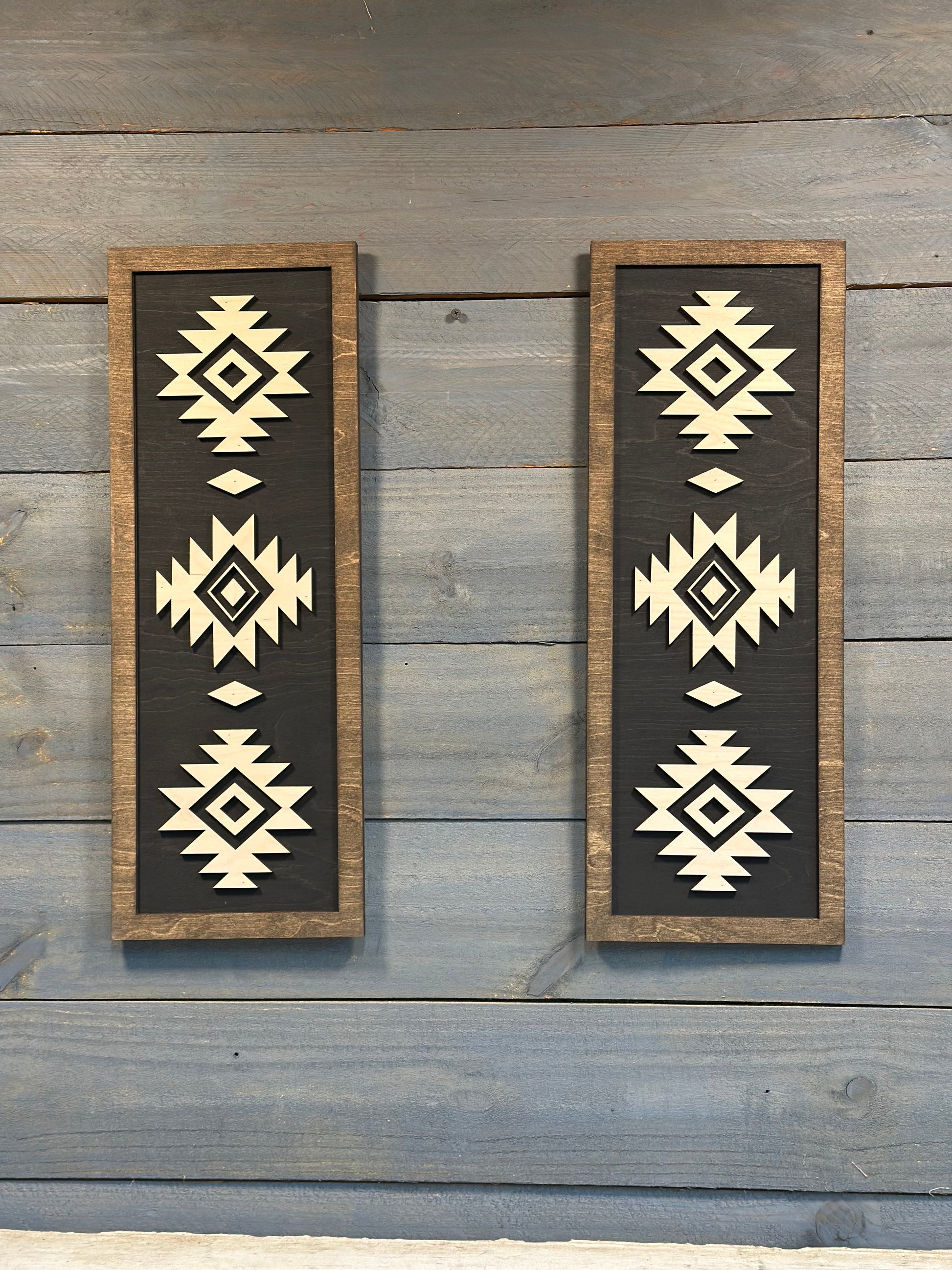 The signs are 2 pieces the back piece is stained black. Words are sanded and left natural with no paint. Frame is stained in Jacobean.