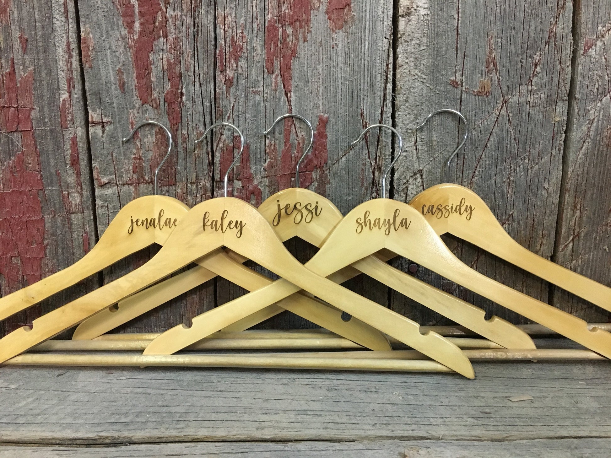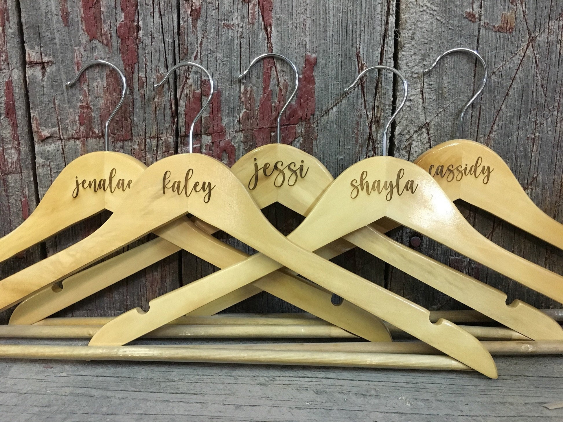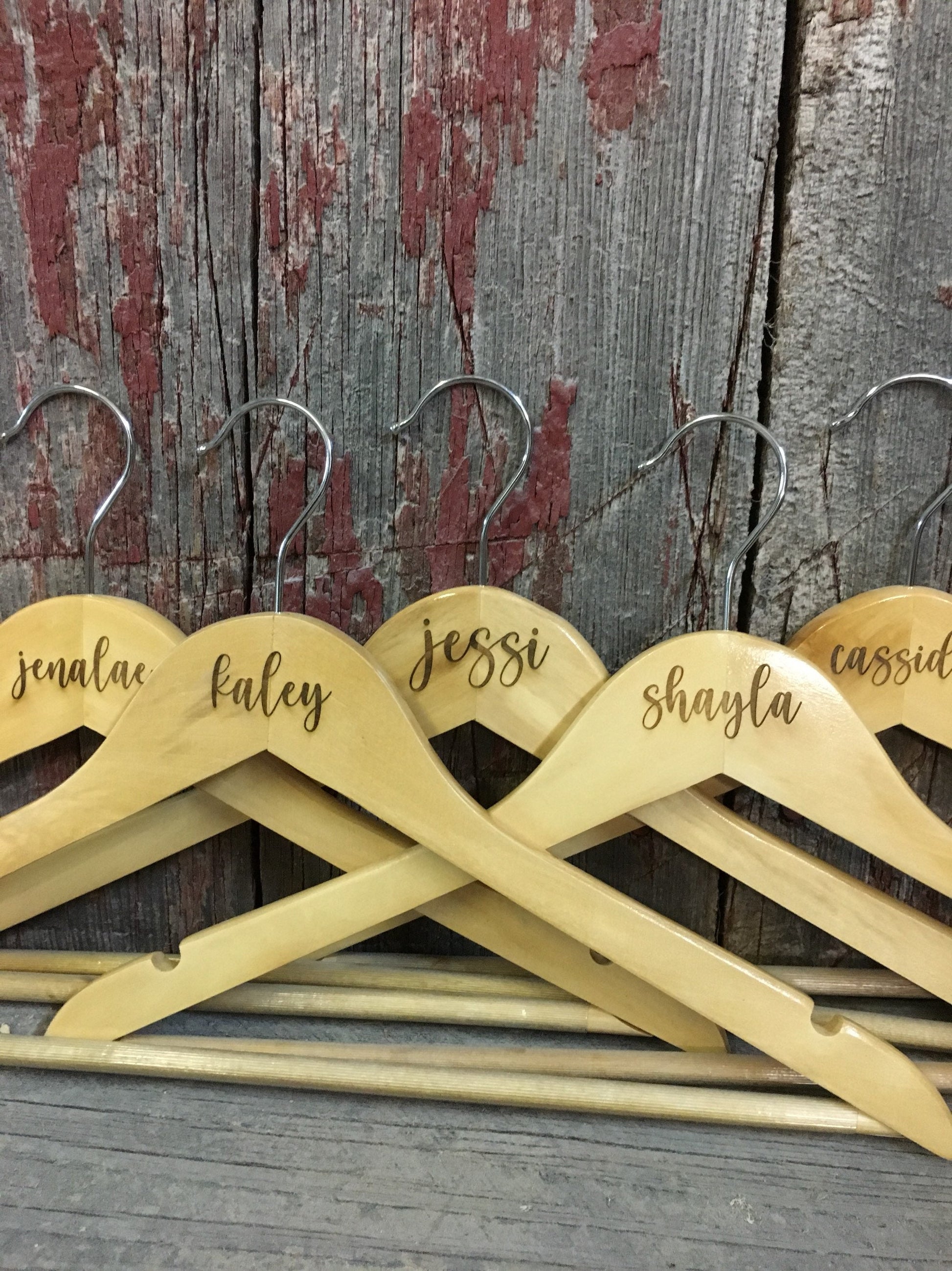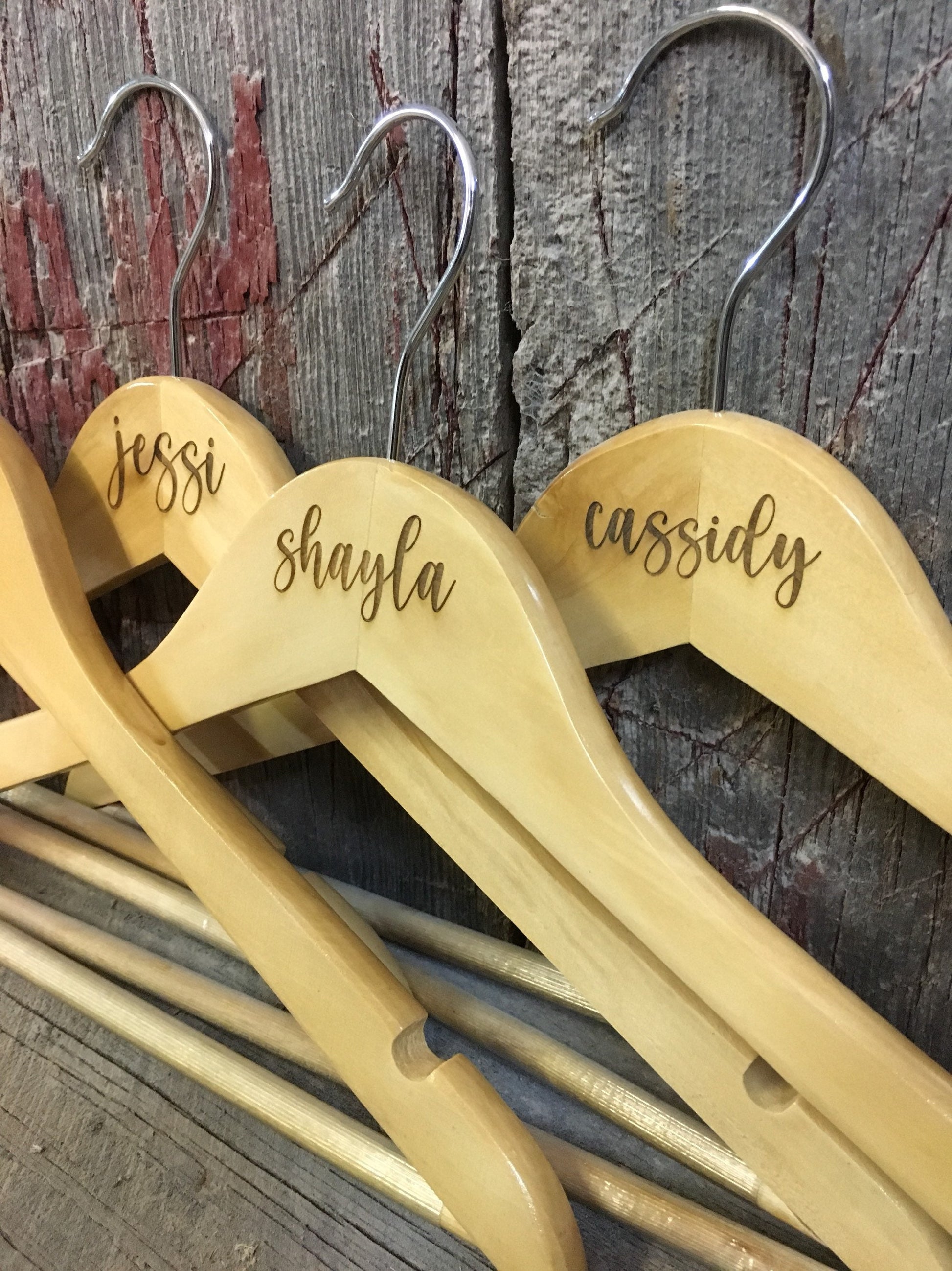 These are regular wooden hangers with the words laser engraved into the top part of the hanger.