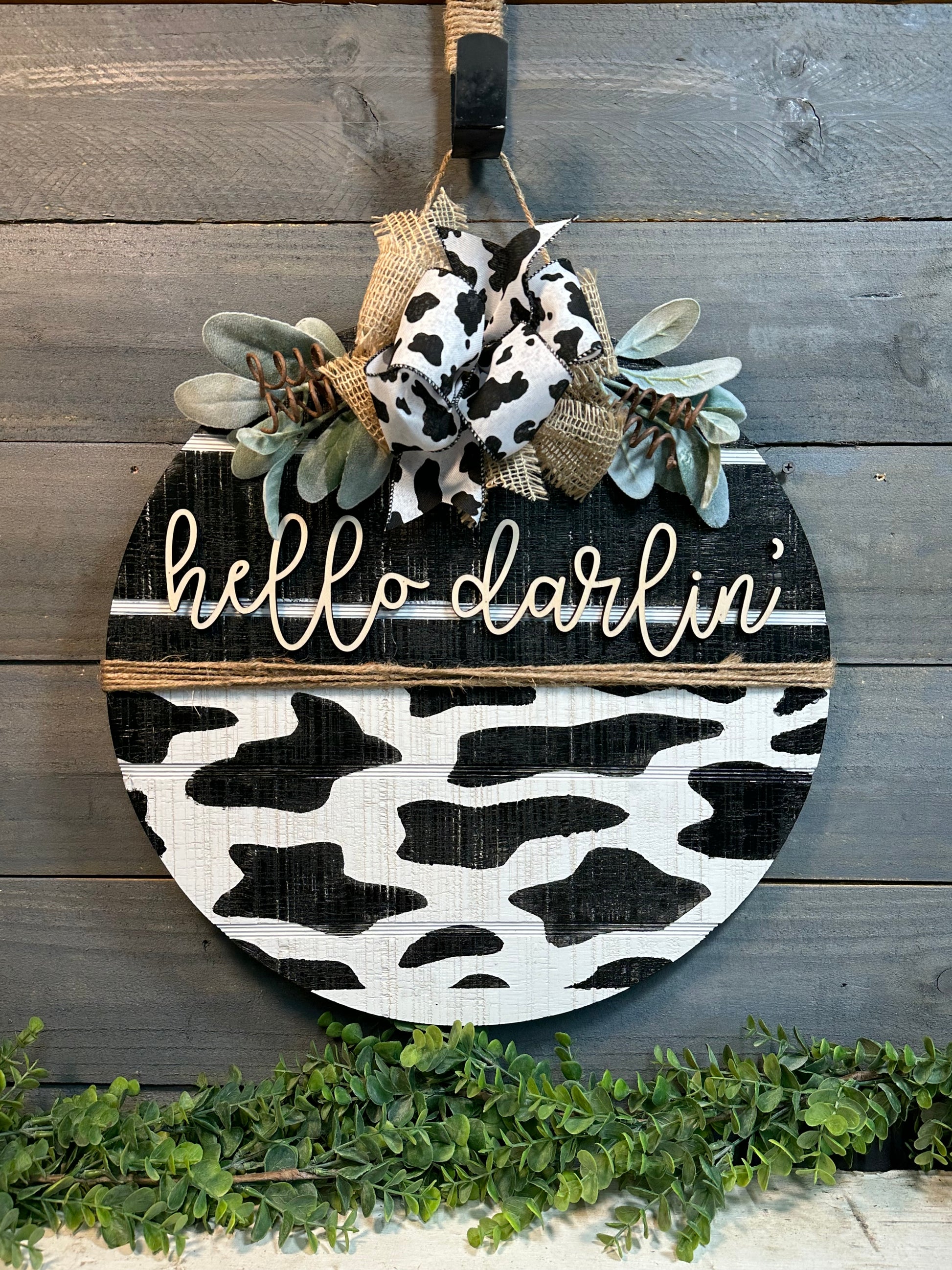 Hello Darlin' door hanger with cow print would look so adorable on your farmhouse front door.