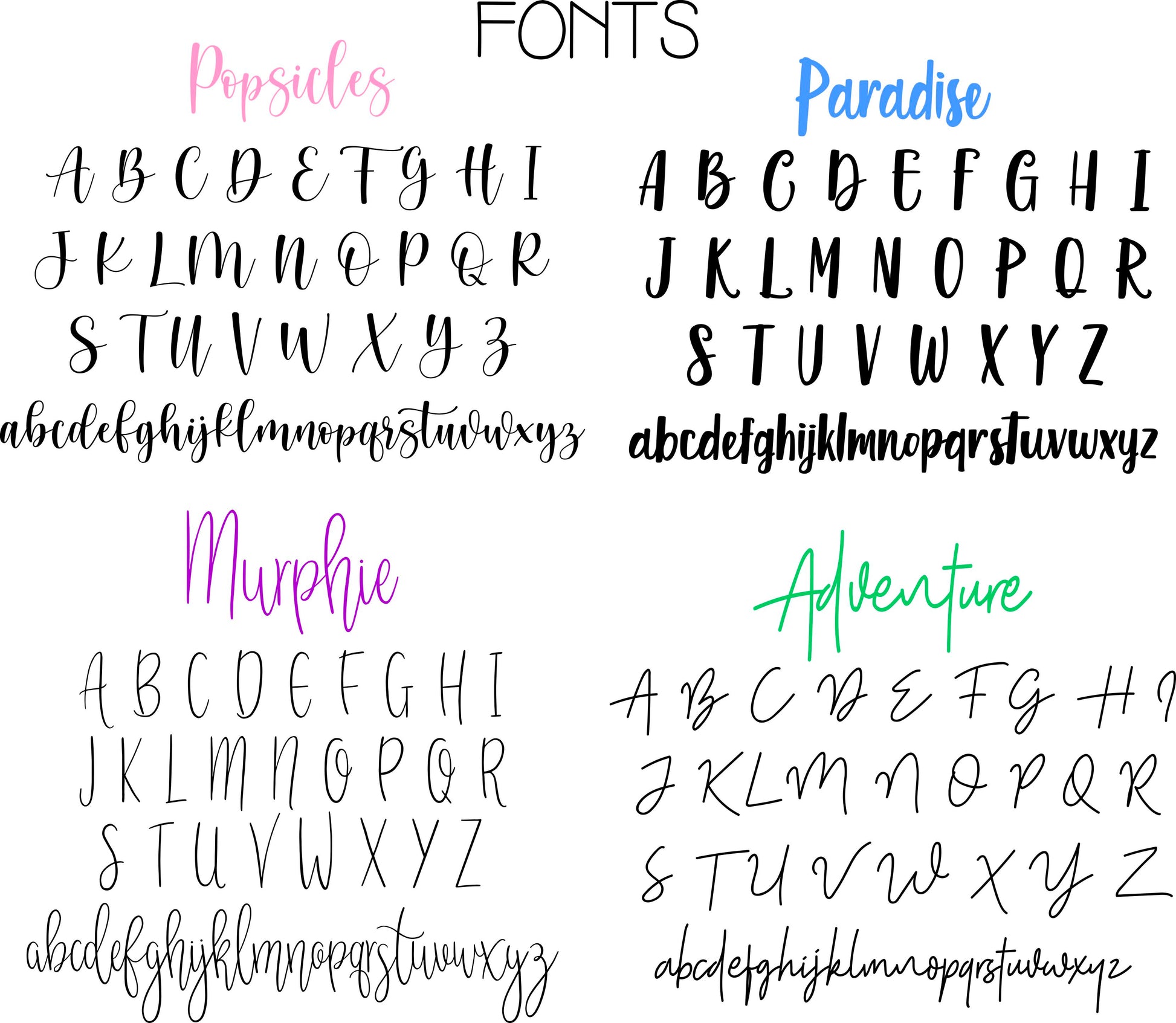 The first name comes in a fancy cursive font and the middle names comes in all caps simple font.